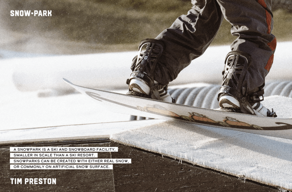 A ‘snowpark’ is a ski and snowboard facility, smaller in scale than a ski resort. Snowparks can be created with either real snow, or commonly on artificial snow surfaces. Built anywhere, and designed to make Skiing and Snowboarding more accessible for all to experience.
